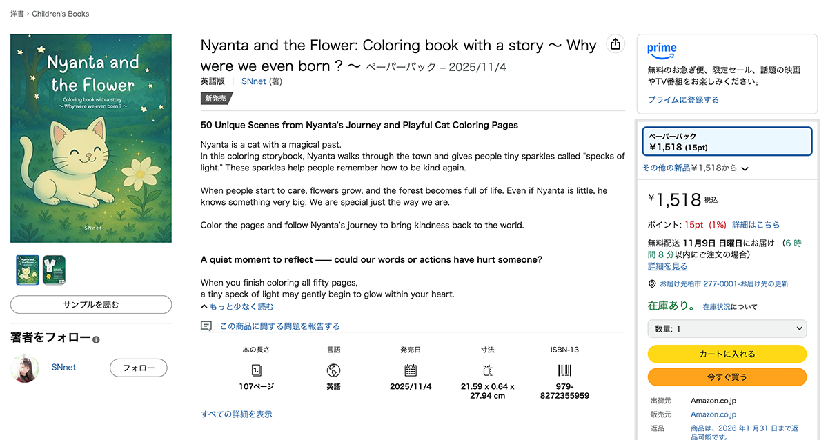 子どもから大人まで楽しめるストーリー付きぬりえブック『Nyanta and the Flower: Coloring book with a story 〜 Why were we even born ? 〜』が、2025年11月4日にAmazonで発売となりました!